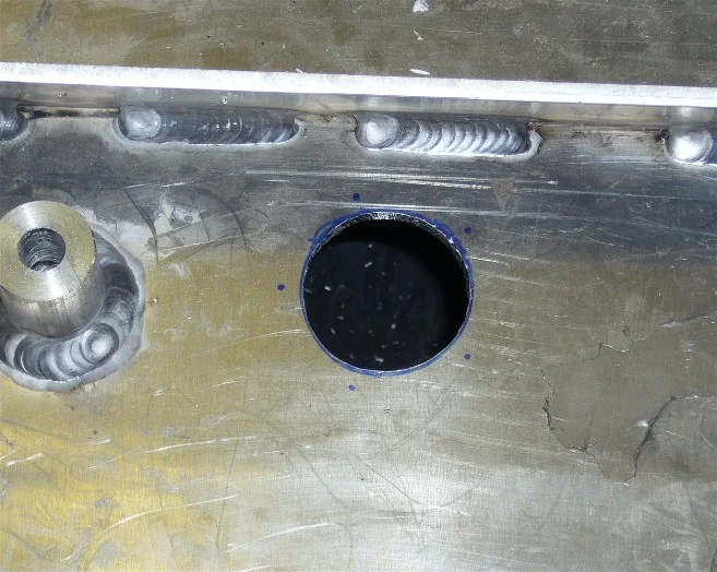 Start by determining the location and outlining your profiles. Measure five times, and cut once. Keep in mind that you will be mounting the sender just adjacent to the rear bulkhead of fuel tank. See red line in RH picture. So, make your hole far enough forward of this bulkhead to ensure trouble free assembly.